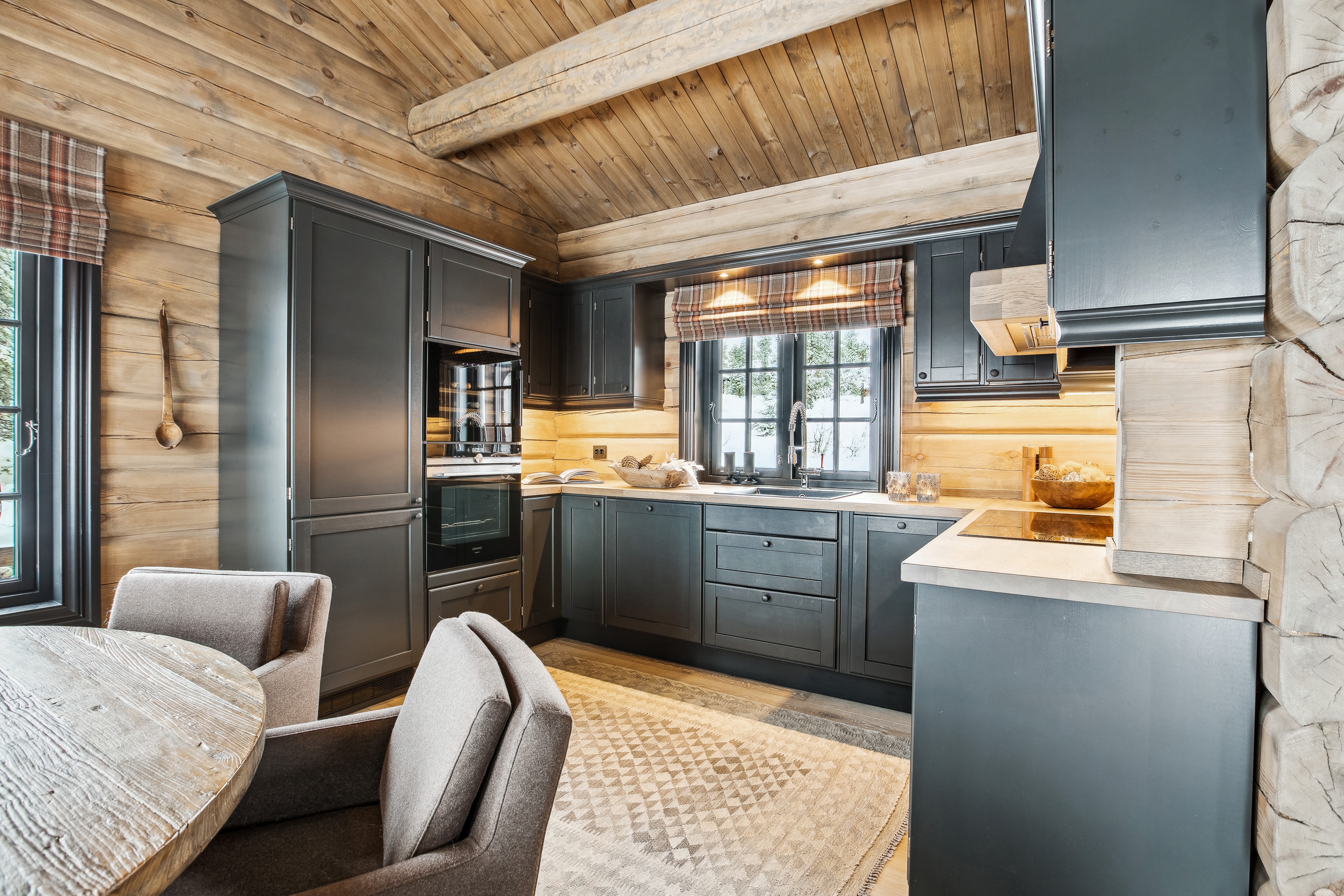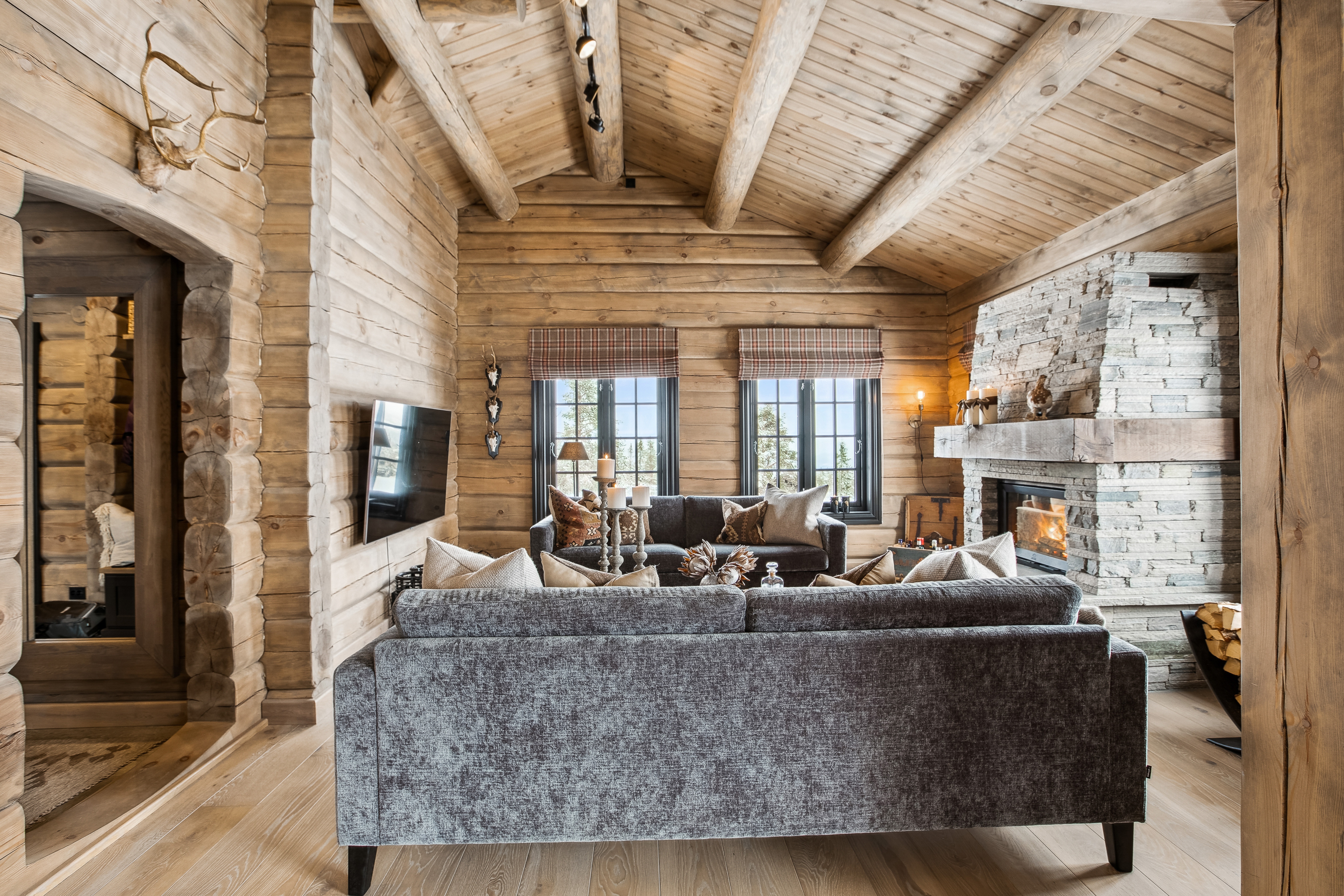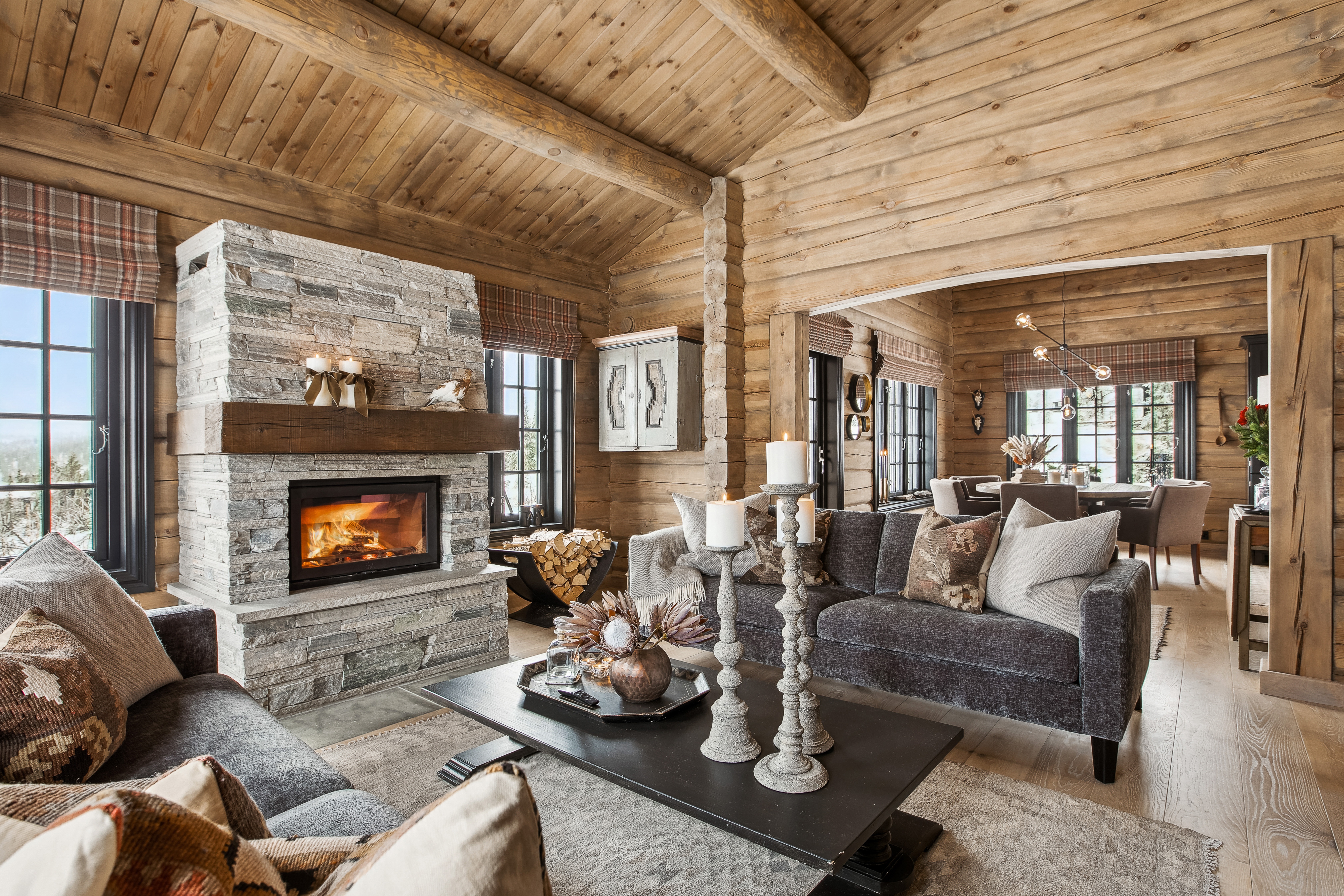 I oppholdsrommet skaper de håndlaftede veggene, den solide skiferpeisen og de store vinduene en varm og lun atmosfære. Her kan man samle familie og venner rundt spisebordet, nyte utsikten gjennom vinduene eller trekke seg tilbake i sofaen foran peisen etter en dag ute i fjellet.