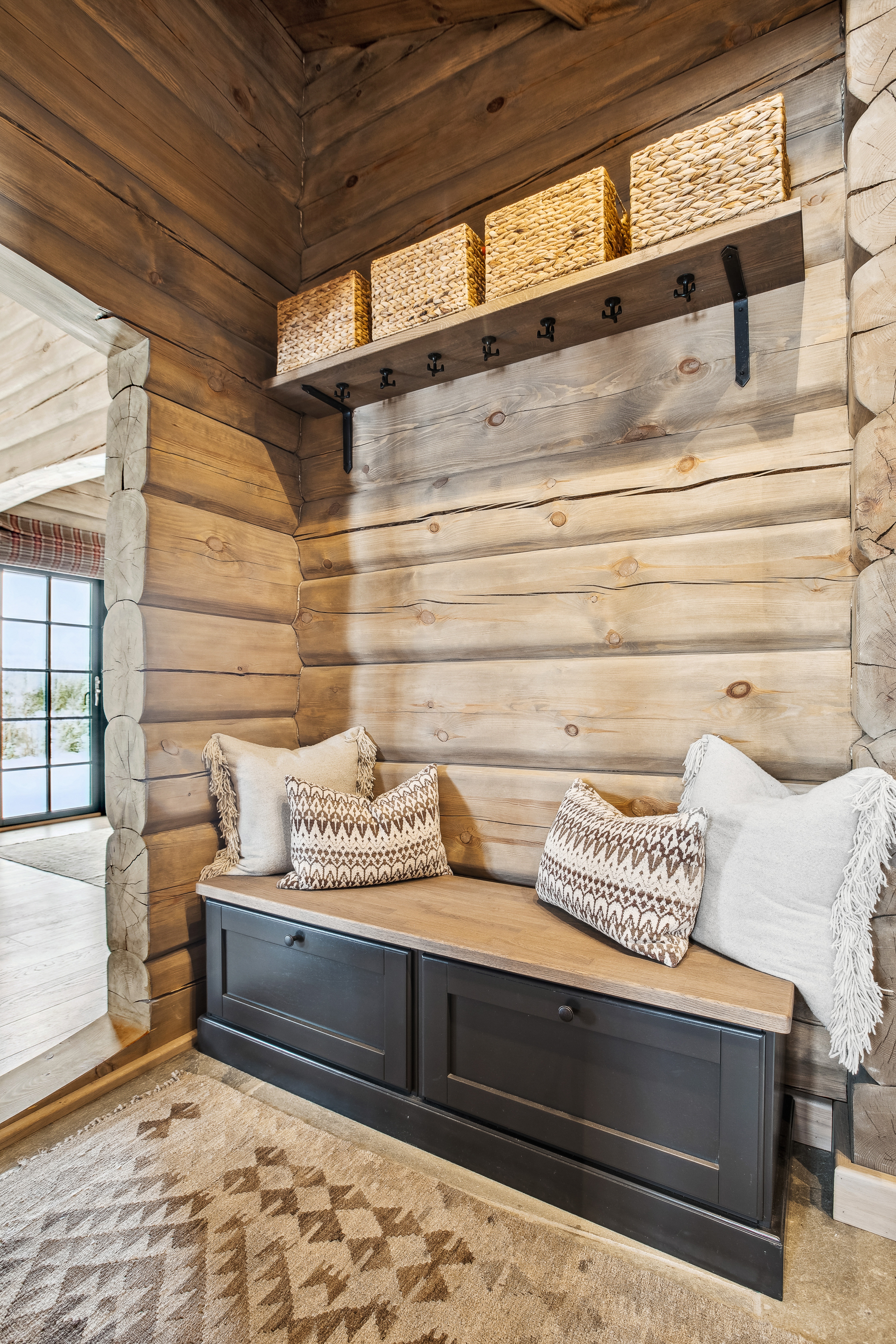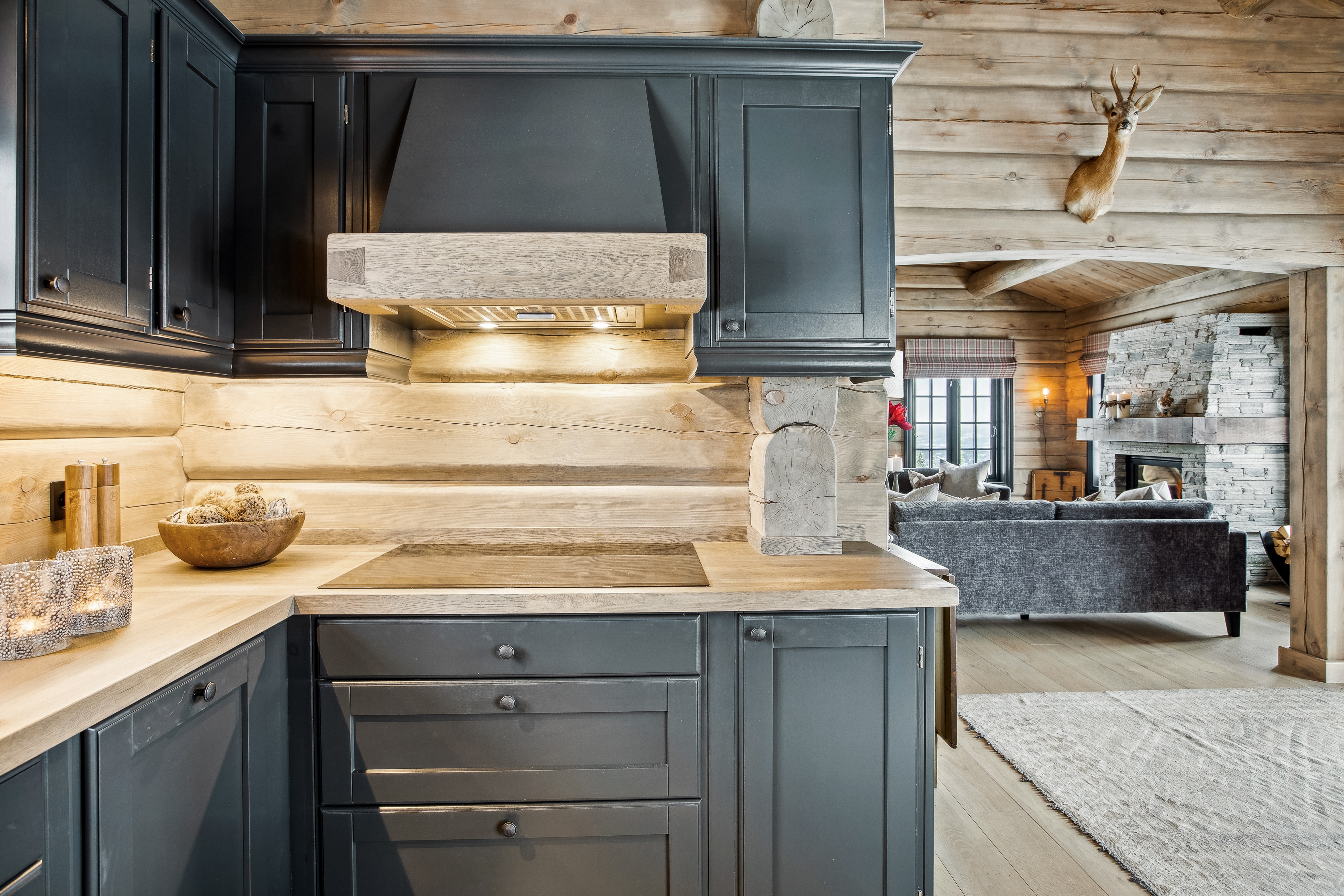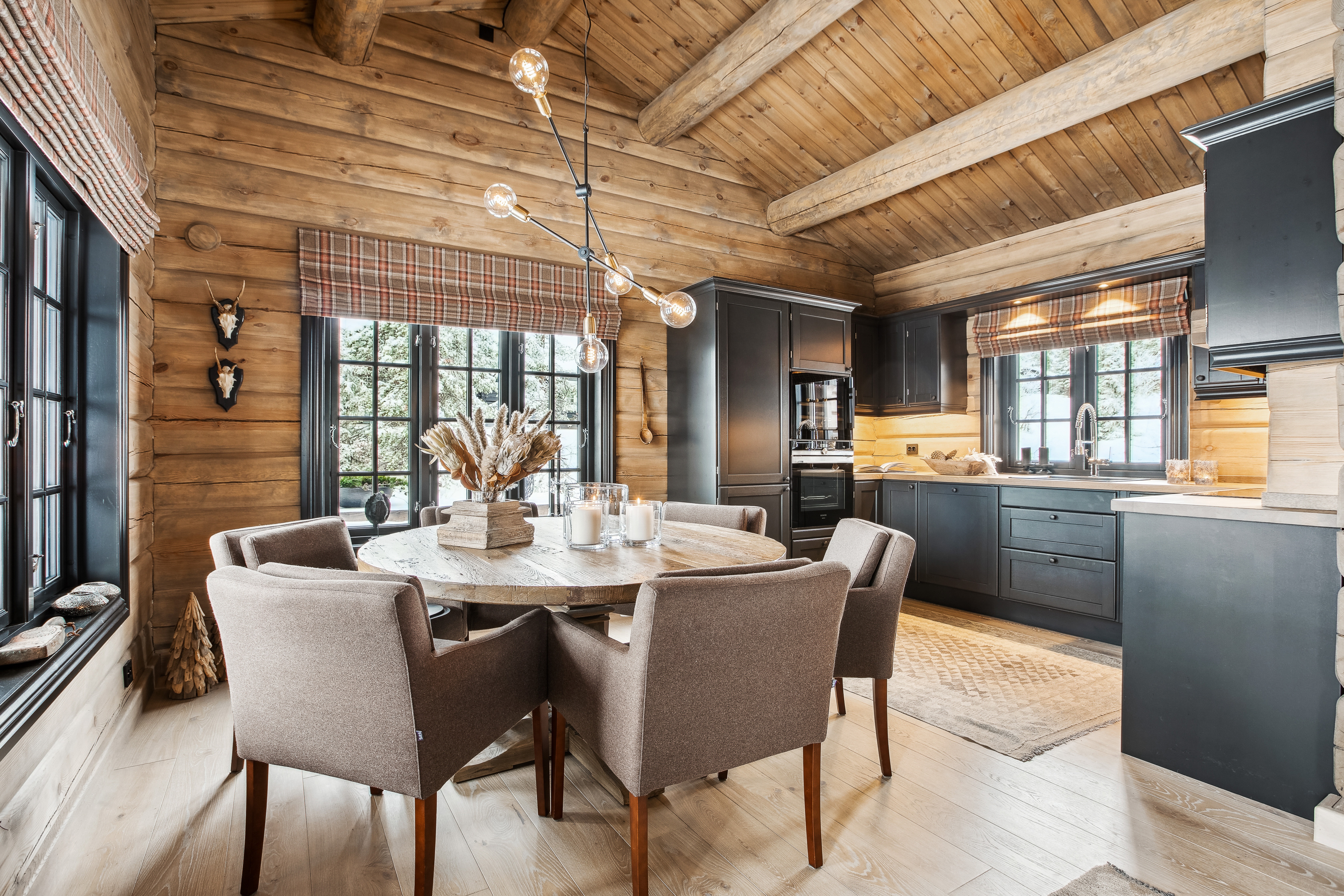 I oppholdsrommet skaper de håndlaftede veggene, den solide skiferpeisen og de store vinduene en varm og lun atmosfære. Her kan man samle familie og venner rundt spisebordet, nyte utsikten gjennom vinduene eller trekke seg tilbake i sofaen foran peisen etter en dag ute i fjellet.