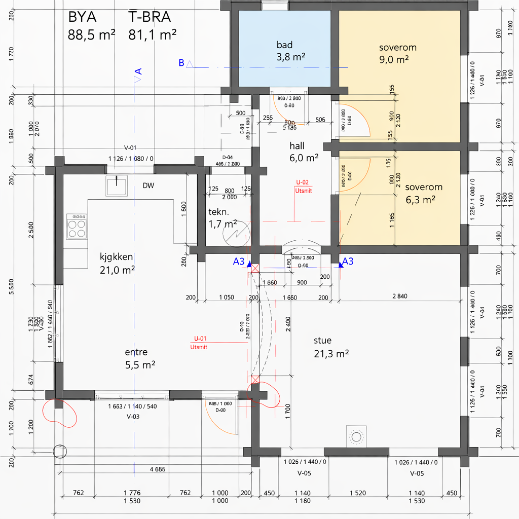 Selv om Kongle er en mindre hytte, oppleves den både romslig og svært gjennomført. Planløsningen er smart utnyttet med to gode soverom, bad og et åpent oppholdsrom hvor kjøkken, spiseplass og stue naturlig flyter sammen.